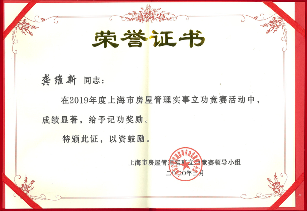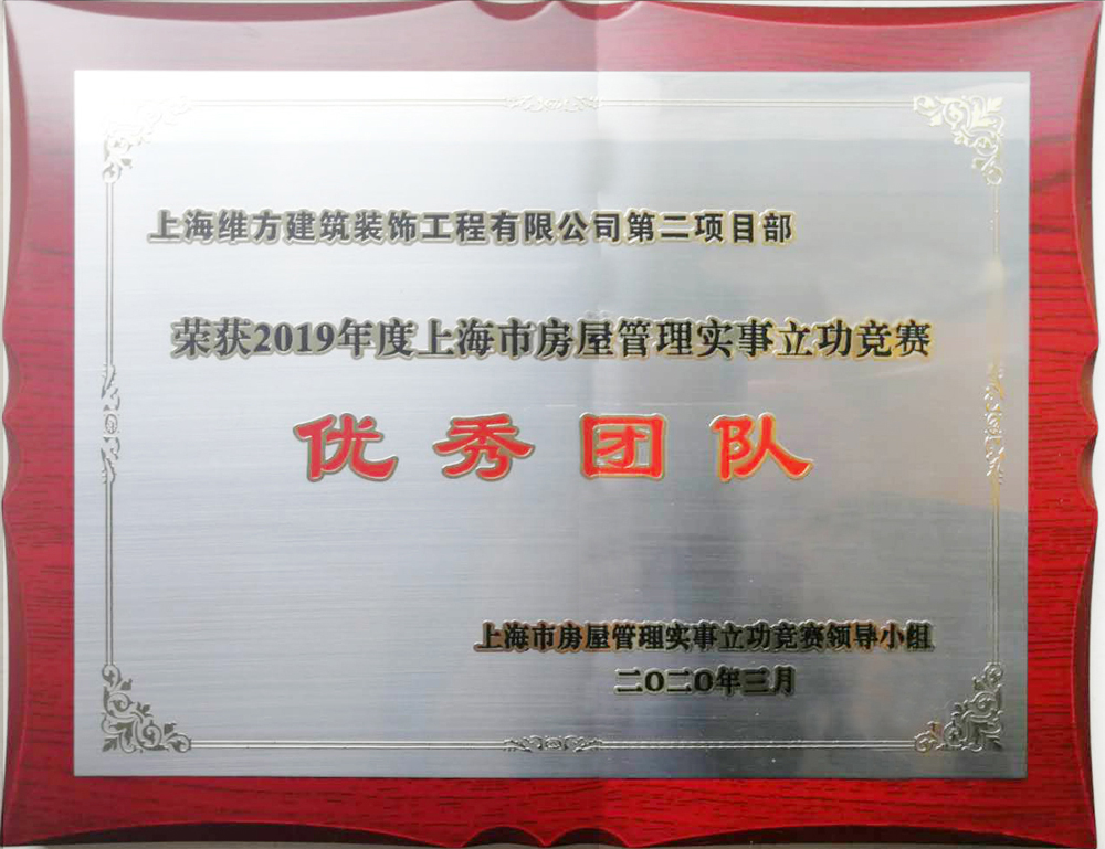 上海維方建筑裝飾工程有限公司第二項(xiàng)目部獲評(píng)2019年度上海市房屋管理事實(shí)立功競(jìng)賽城市更新分賽區(qū)優(yōu)秀團(tuán)隊(duì)稱號(hào),公司總經(jīng)理獲評(píng)記功個(gè)人。