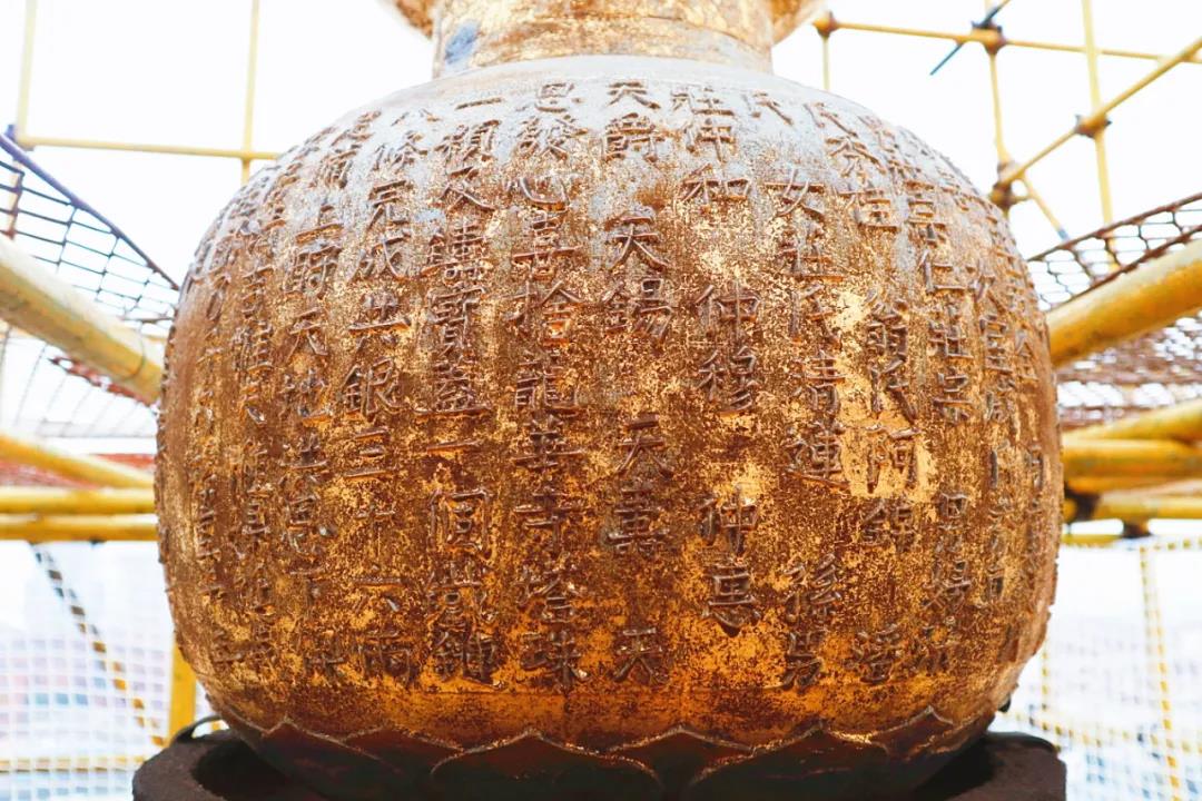 ? ? ? ? 龍華塔是上海地區(qū)保存最完好的宋代樓閣式塔,明人馮遷譽(yù)其為“千年飛塔”。舊時(shí),“秋江塔影”與“龍華晚鐘”同樣蜚聲海內(nèi)外。龍華塔頂端塔剎葫蘆,上一次貼金箔修繕是在1984年,歷經(jīng)時(shí)間和風(fēng)雨的洗禮,斑駁銹蝕,金箔缺損嚴(yán)重。本次保養(yǎng)維護(hù)過程中,維修人員為塔剎葫蘆重貼金箔,再現(xiàn)璀璨金光。