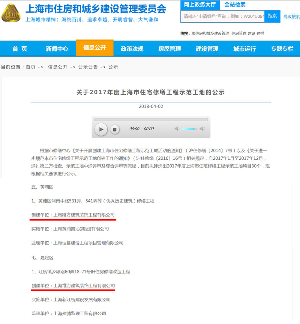 上海維方兩處項目獲2017年度住宅修繕示范工地公示